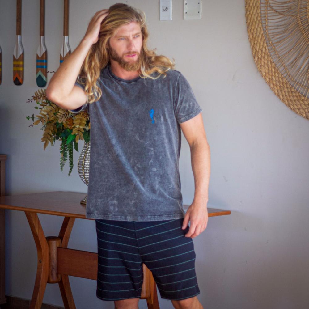 Modelagem tradicional e clássica. ótima opção para quem busca uma modelagem comercial e que combina com vários estilos diferentes. Malha beneficiada com tratamento que alivia torções e encolhimento. A peça é tingida no pigmento (stone), depois passa por um processo de estonagem, feito através de um biopolimento, o que dá uma aparência lavada à peça.